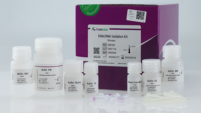The DNA/RNA Isolation Kit allows rapid and simultaneous extraction of DNA and total RNA from cultured animal cells or tissues, and large numbers of different samples can be processed simultaneously. The reaction can be completed within 40-50 minutes. The extracted DNA and total RNA are of high purity, and can be used in various molecular biology downstream experiments such as PCR and RT-PCR, etc.