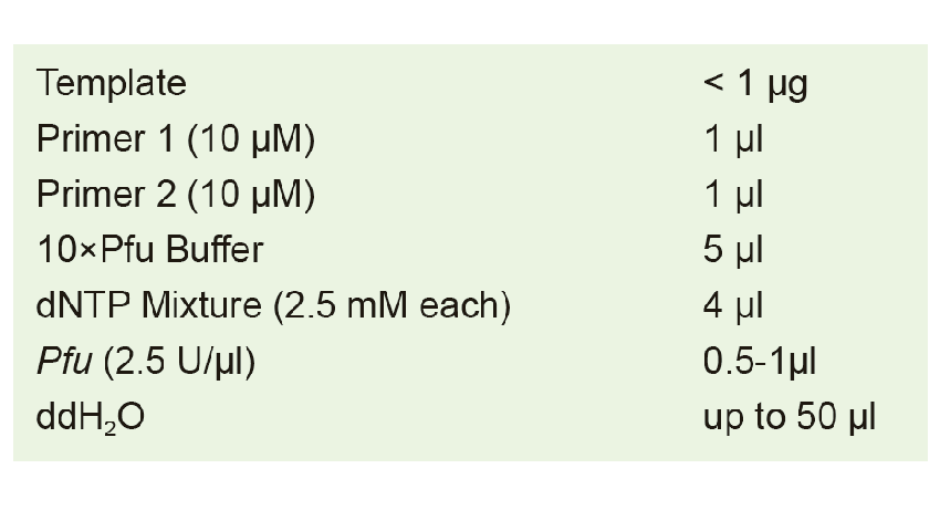 ● The extension of Pfu DNA Polymerase is about 500-1000 bp/min normally. Because Pfu DNA Polymerase with 3’-5’ exonulease activity may degrade the primers, it should be added later than other components, and immediately go to PCR step.