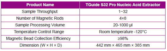 The TGuide S32 Pro is small in size, light in weight and attractive in appearance. It has a large LCD display, an embedded real-time operating system, a powerful program editing function, and is simple and easy to manipulate. Additionally, the working area is fully enclosed, with open door protection, an over-limit protection and an alarm, making it safe and reliable to use. With the dedicated reagents and consumables, it can extract the nucleic acid from blood, cells, tissues, viruses, serum, plasma and other samples automatically, producing reproducible results while saving time.