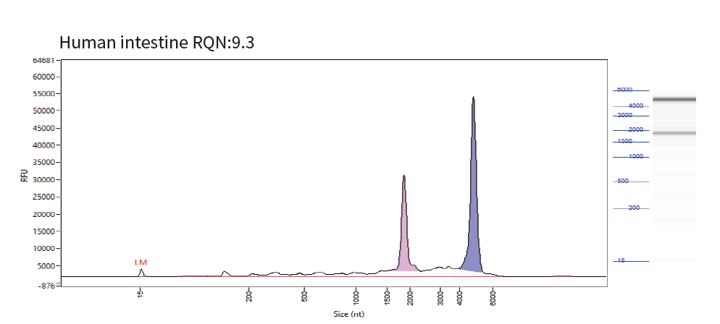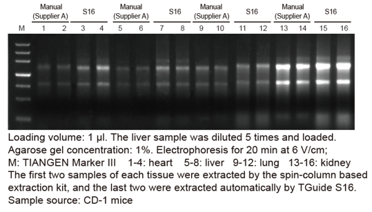 The samples in the above table were taken in the recommended amounts according to the protocol. Using the TIANGEN Magnetic Hi-Tissue/Cell Total RNA Kit(GDP671), and the total RNA was extracted by the automated nucleic acid extractor. Elution by 100 μl and load 5 μl by electrophoresis.