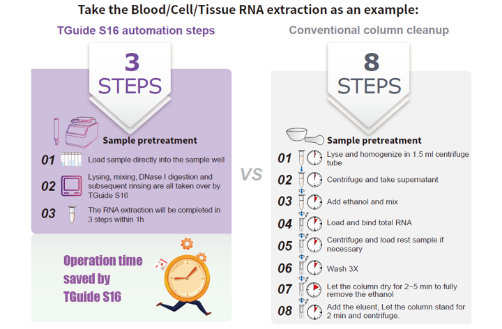 TGuide S16 Nucleic Acid Extractor can process 1~8 or up to 16 samples simultaneously by the magnetic rods to bind and transfer the magnetic beads, the 96-well plate or single-sample reagent cartridge and magnetic tip comb. TGuide S16 is an affordable choice for academic or industrial labs to extract nucleic acid automatically from various sample types, including animal and plant tissue, blood, virus, PCR product, agarose gel, etc.